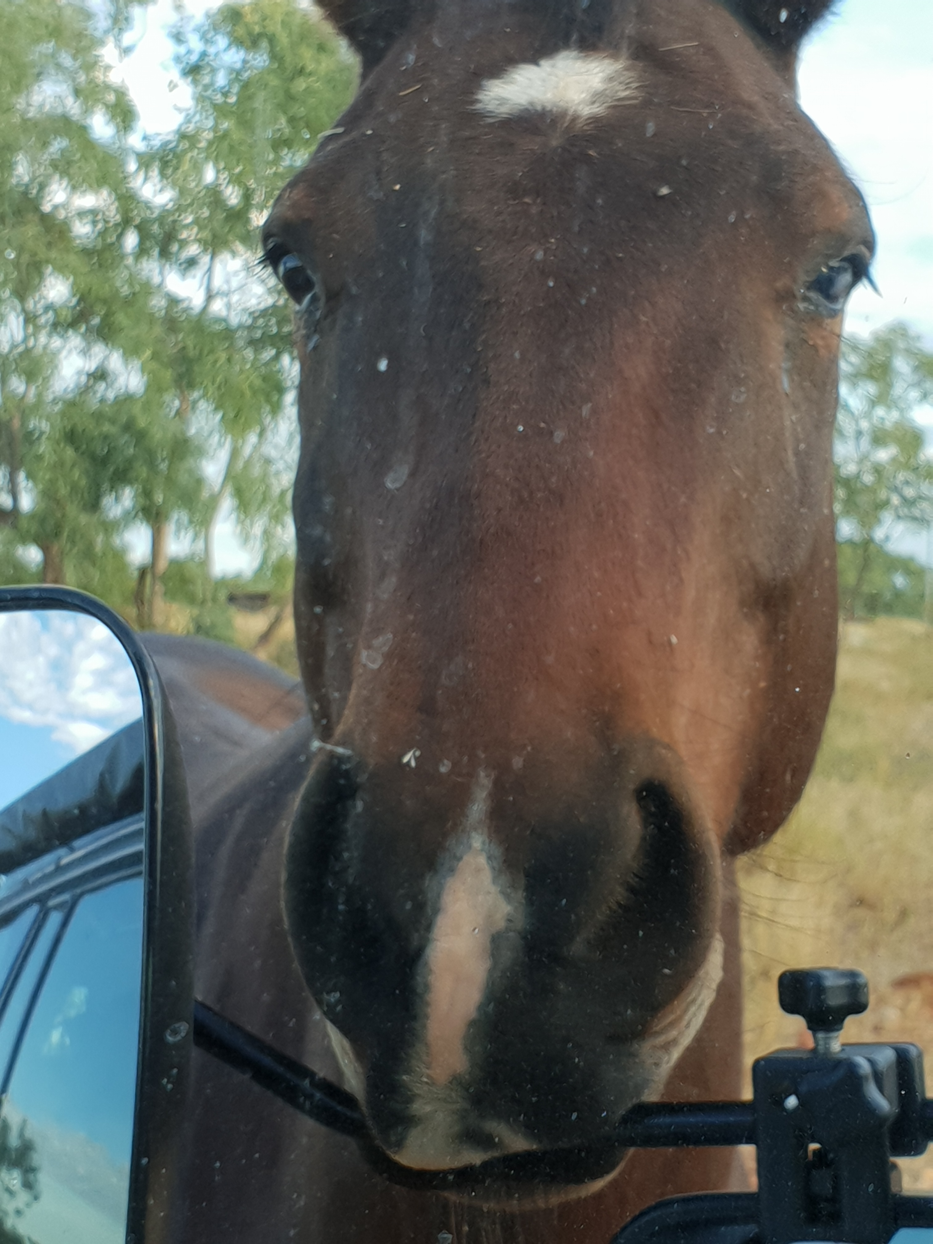 We were given permission to explore the station some more so Jock, Emma and I jumped in the car and had a good look around. It was so interesting. One of the fourty water holes of the property was close to our site, it was full of birds and some cattle. We then came across some horses, they looked friendly enough and we stopped to take some photos from the window of the car. The horse started to wander towards us and before I knew it it was trying to get its head in the car, I put the window up not knowing if id get bitten or not. It chewed on our mirror!! Emma was laughing her head off.