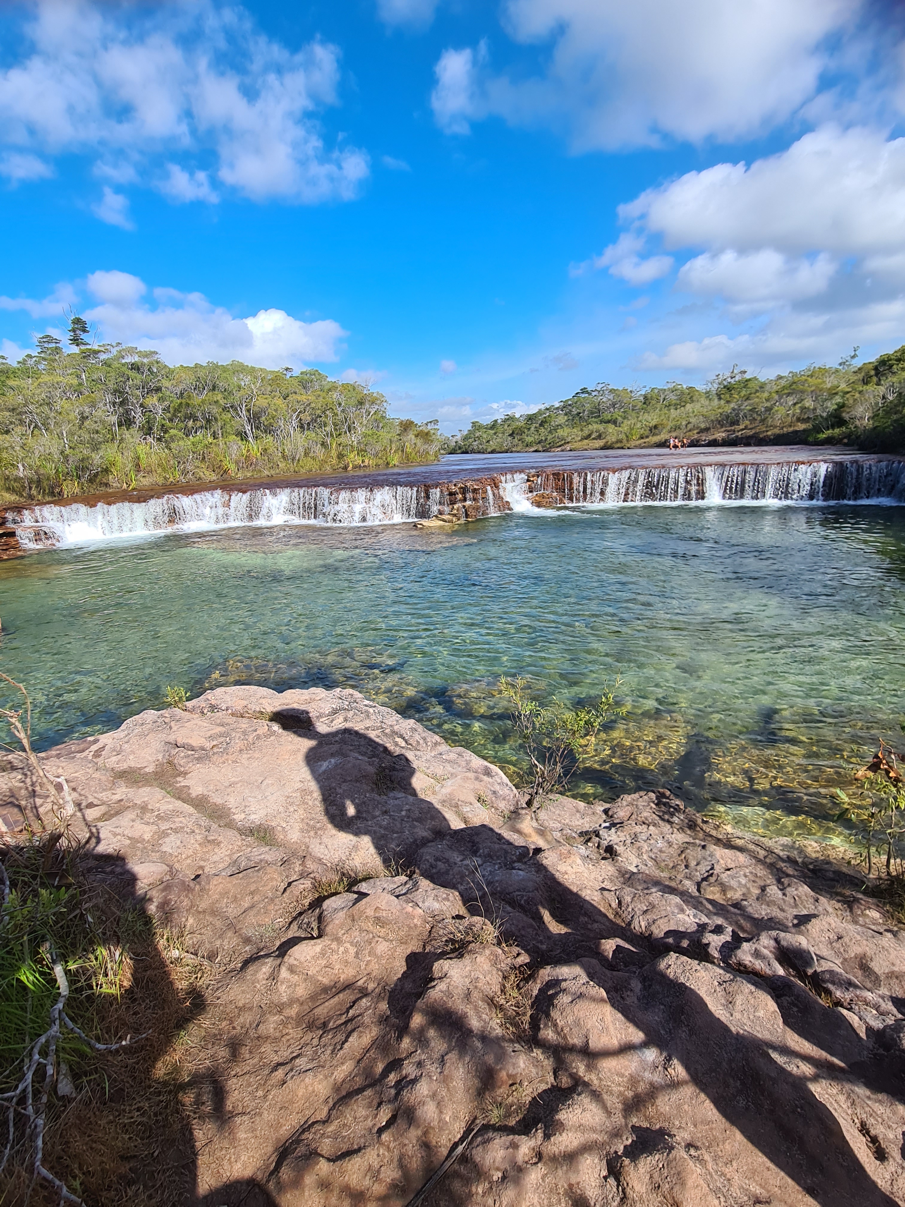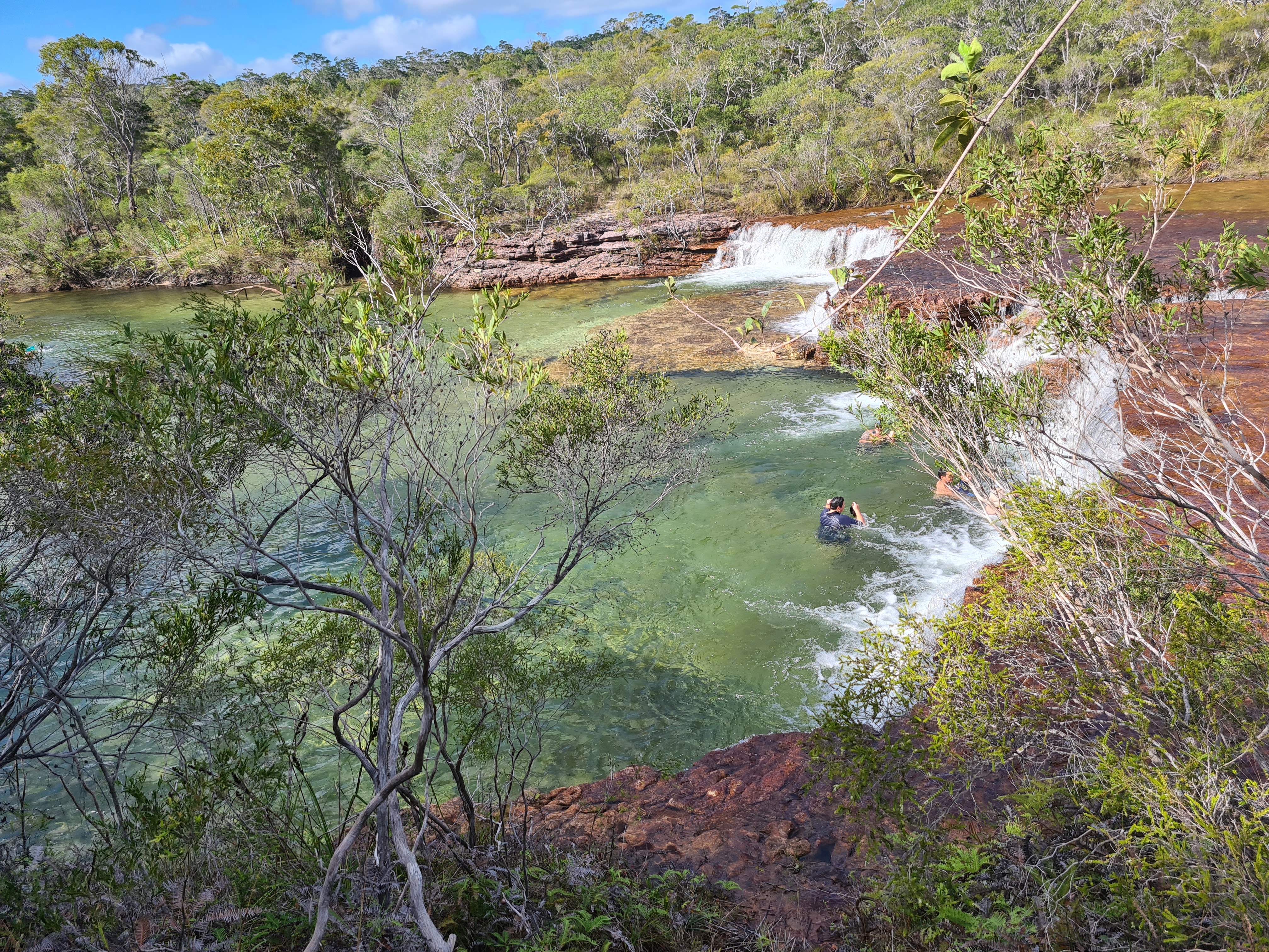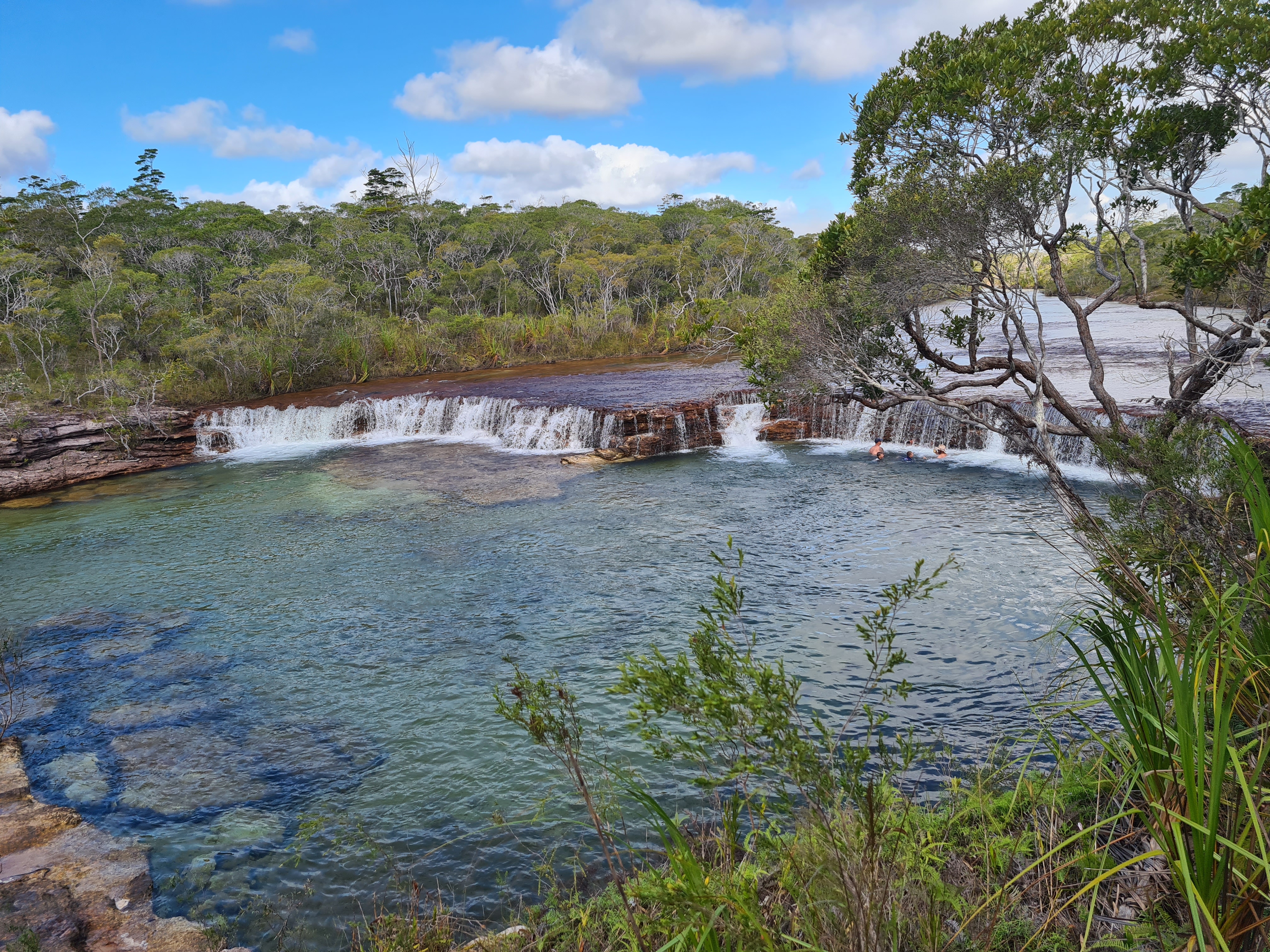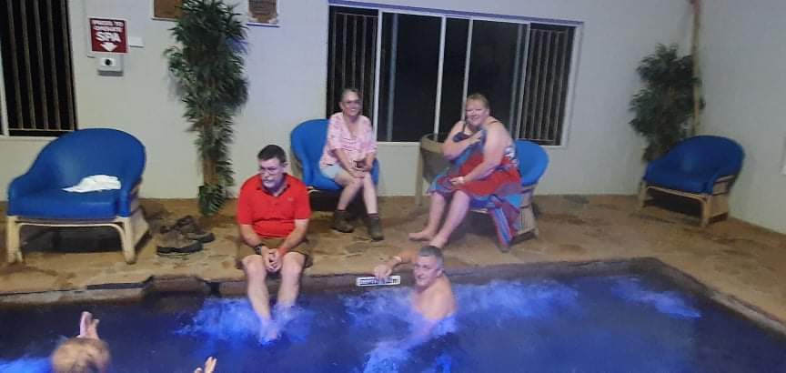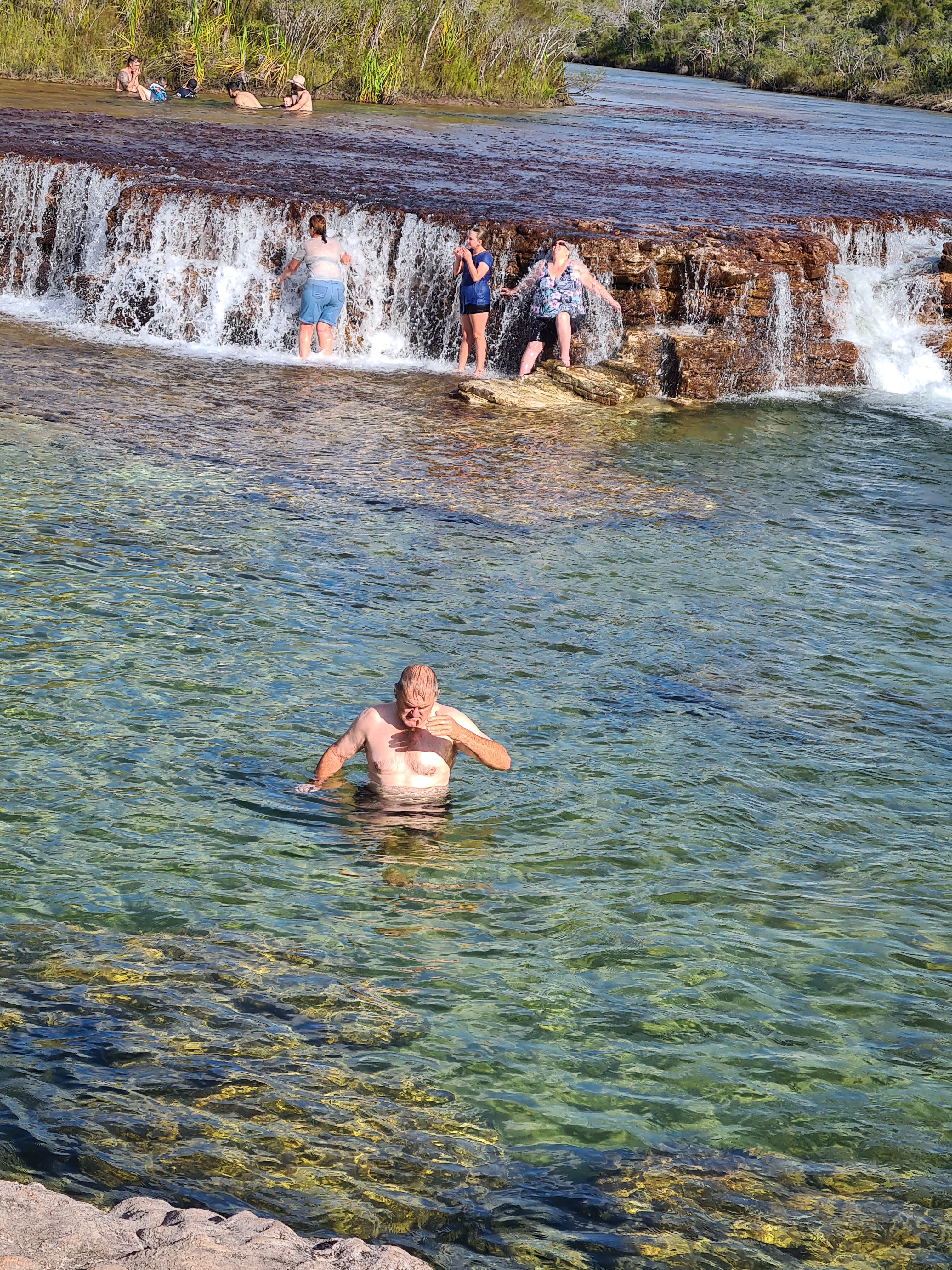 Once again the roads were terrible and definitely getting worse, we had made the right decision coming up a bit earlier with all the traffic that is about. By the time we got off the barge it was not long before we saw the sign for Fruit bat Falls, Michelle had also found an overnight stop for us just about 10k up the road from the falls. So we had asked Scott if he wanted to go to the falls, he didn’t, so we parked up at the entrance to the road and Scott stayed in the car with the dogs. We jumped in the car with Michelle and Trevor as this is one of those places that does not allow dogs. The falls were not far down the track and after we had parked up we walked the short walk out to them, Wow! They looked just lovely and people were in swimming so we decided we were definitely getting in too. We had worn our swim suits here just in case. Emma and I were put off a little as Jock spotted a snake, it was swimming along the edge of the rocks. Trevor kept an eye on it as we got in, he said it was busy hunting the falls banks. I was also aware that there were most probably fresh water crocs in there too but the water was so clear surely I would see one if there were! I was being very brave!!