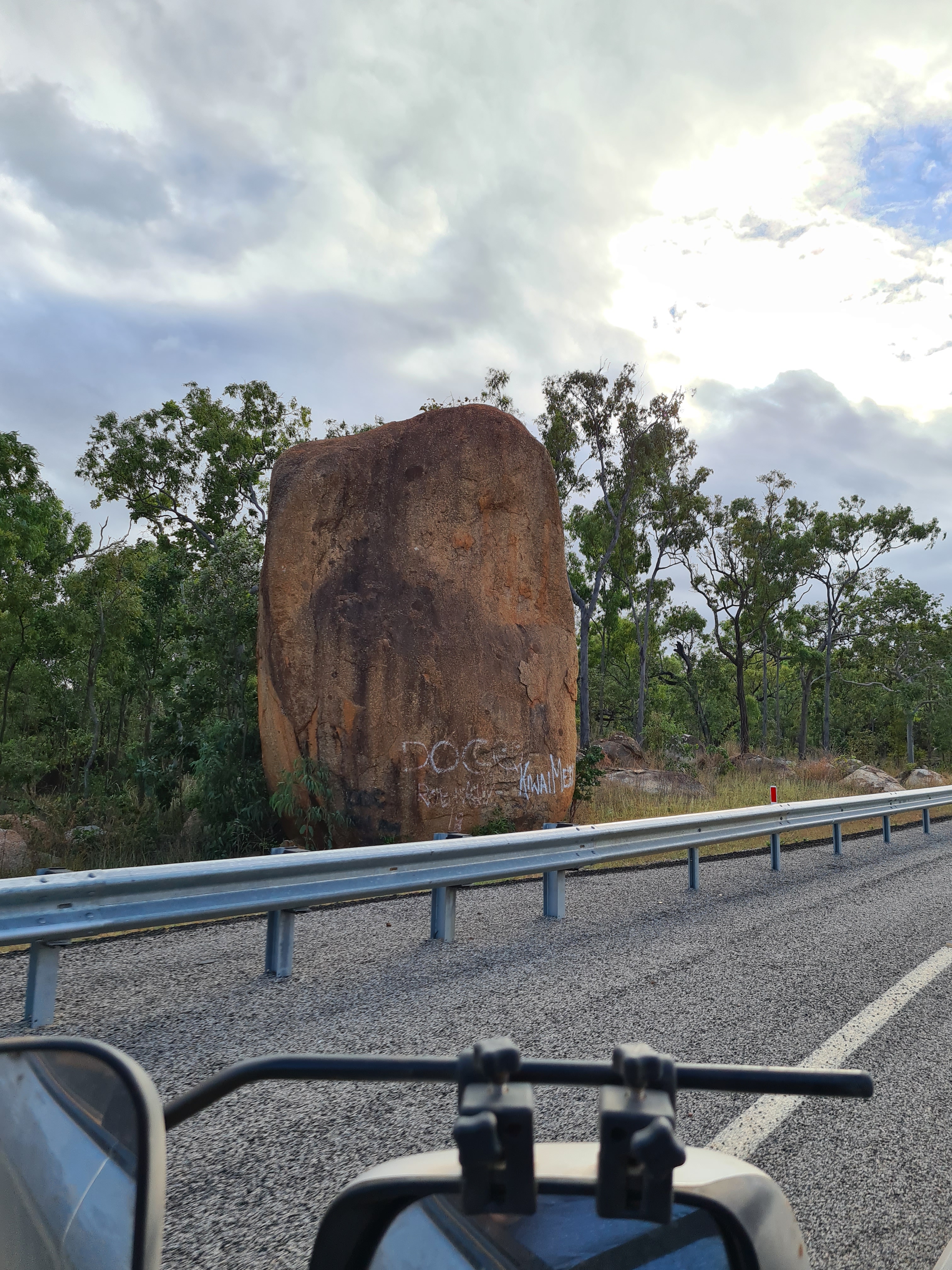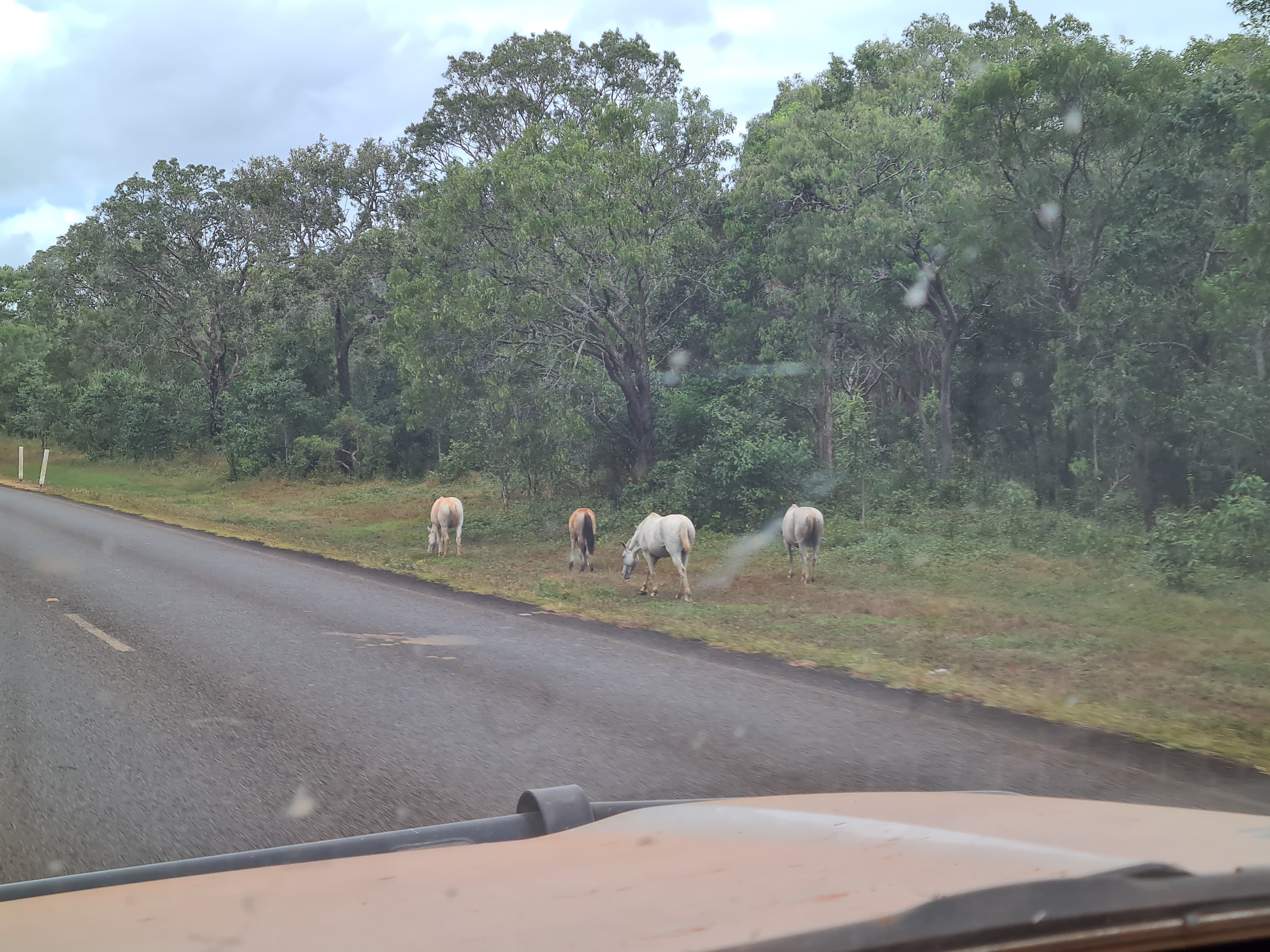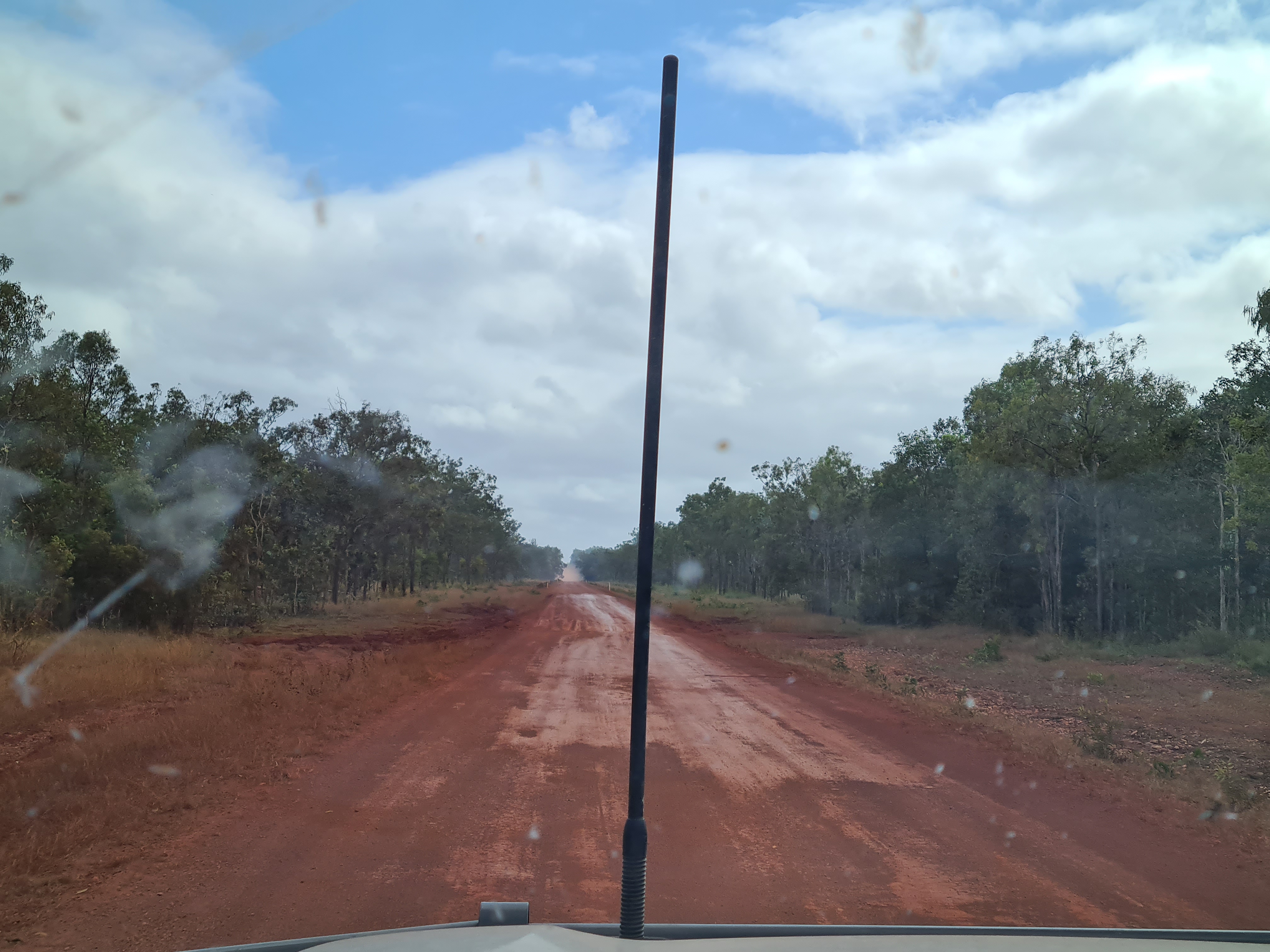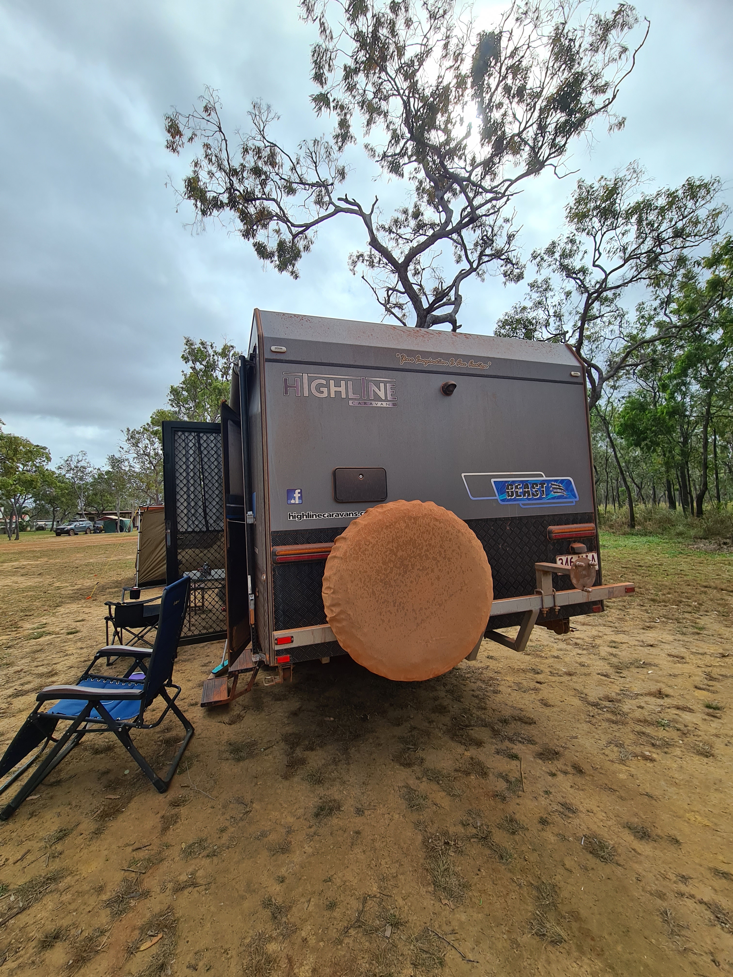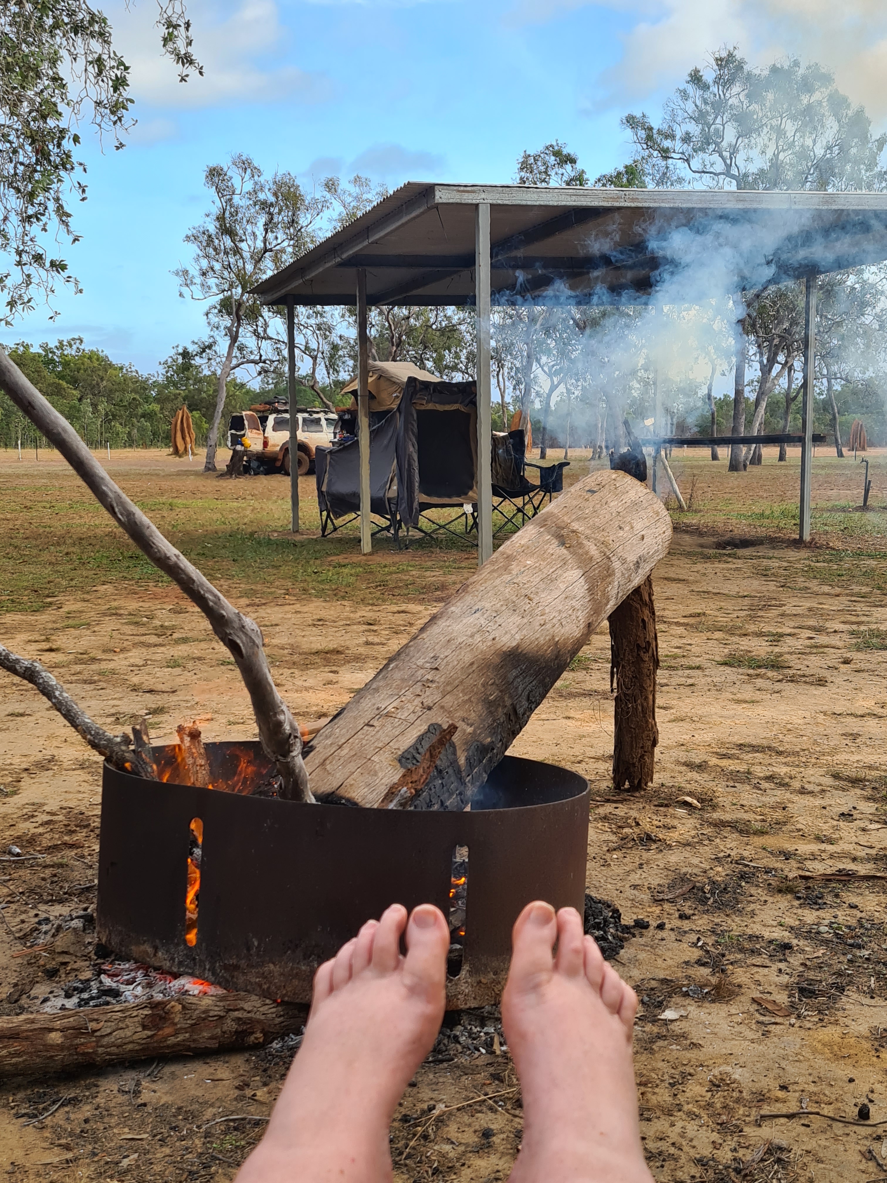 Lots of very bad big corrugations and dips in the road saw us arrive at Bramwell Roadhouse before the crowds. We had pick of a site, we pulled up right by a huge termite mound and a little covered area for Scott to put his swag under. It started to rain but was short lived and to be honest it was lovely having it on our skin cooling us down. I am so glad it cools down at night I can handle the heat if I can get a comfortable night. The roadhouse actually does an alright coffee, all my coffee’s so far have been pretty shit I wish I had brought my machine along with me. On our way here we drove through a little fire at the side of the road, there is a lot of burning off going on around here.