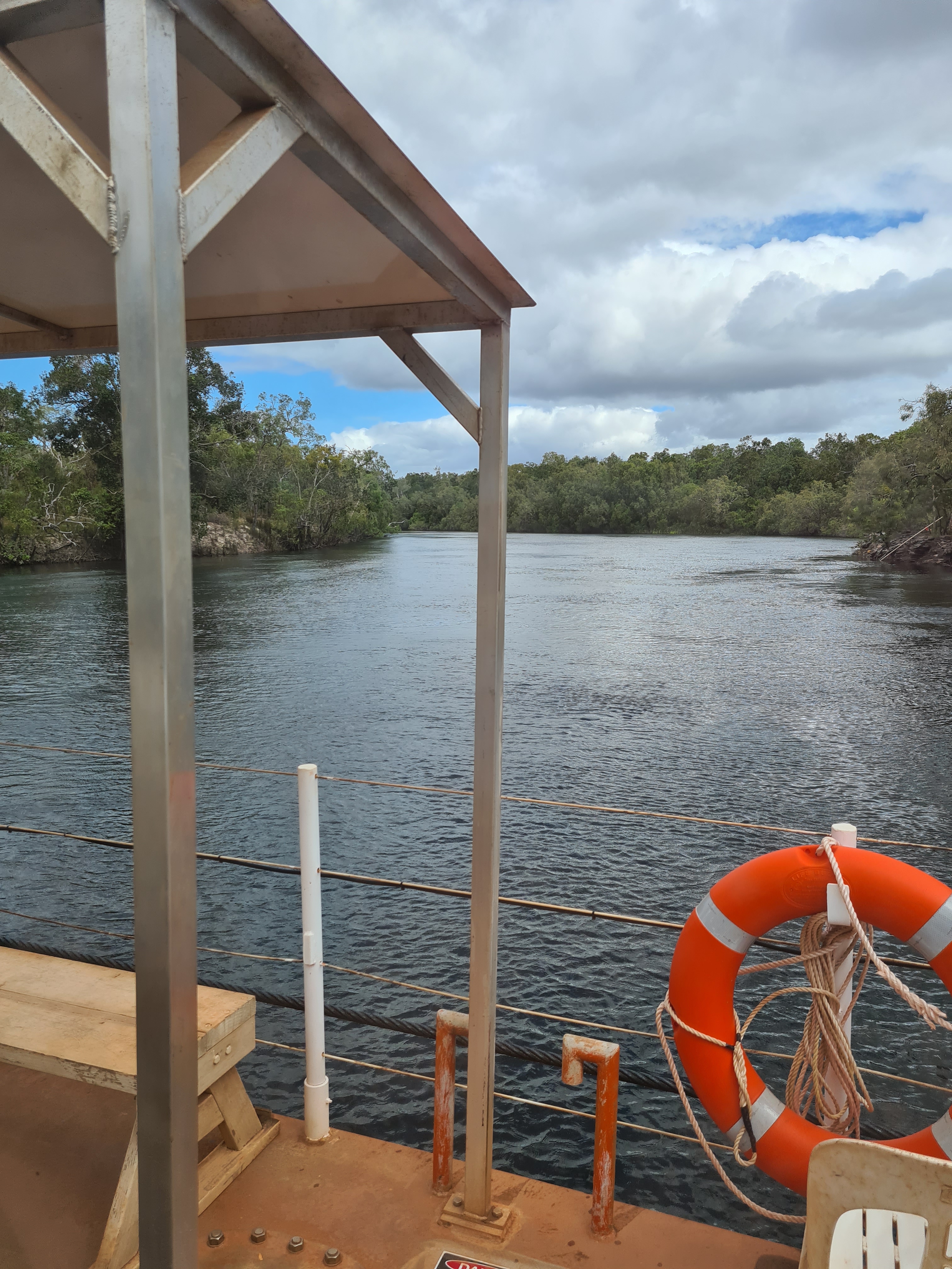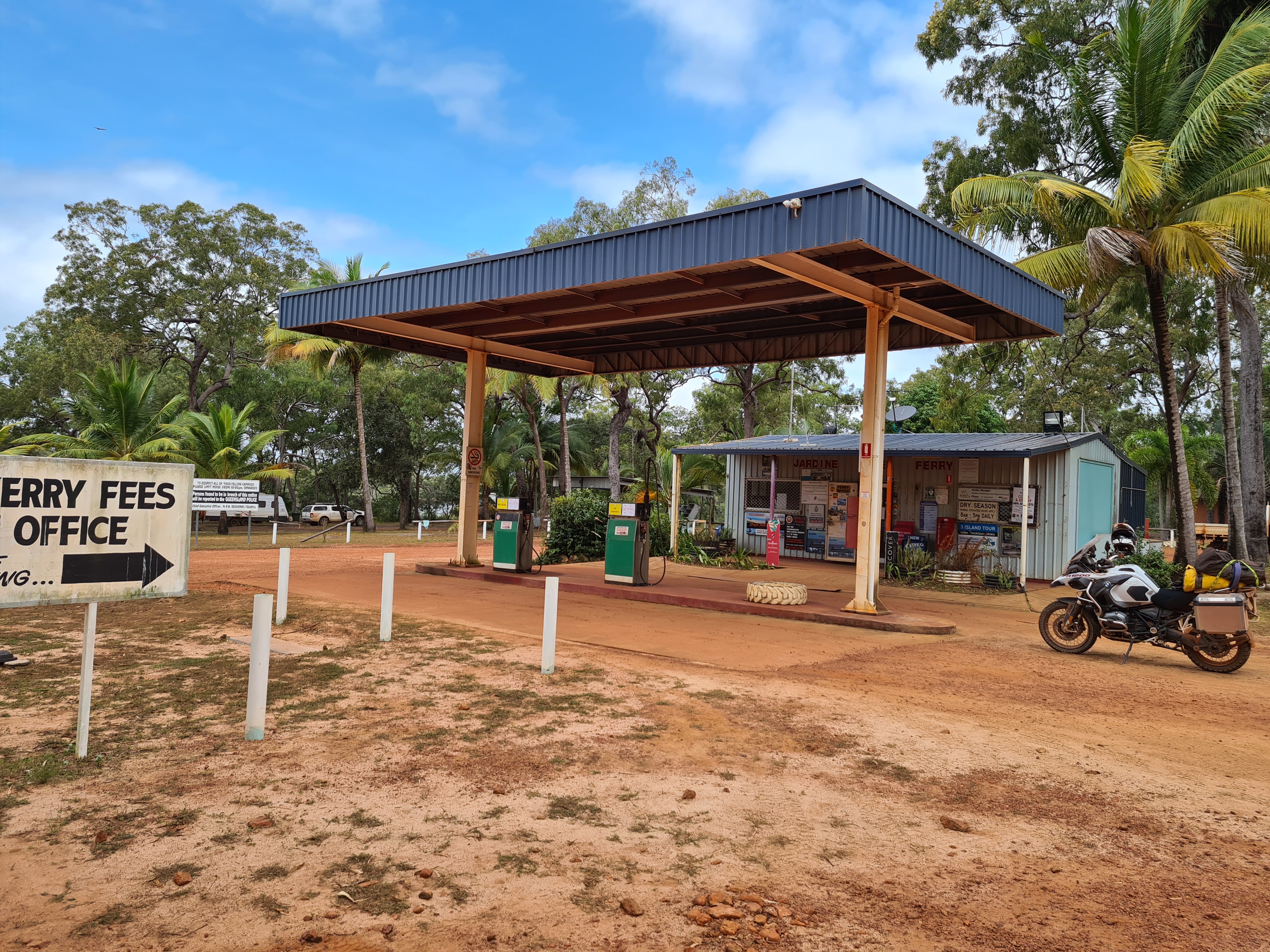 Thank goodness we left the vans! The roads were terrible, the worst we had come across yet and with the amount of traffic I am sure they will be worse on our way back down. Some corrugations were so big we really did have to slow down for them, normally we ride on top of them but no way could you do that with these. On occasion we used the dirt at the side of the main road as it was nice and smooth. We still encountered the idiots that think once you hit the dirt its a race and how they can see whats coming in among our dust I don’t know. We had been told it was a long wait to get across the river on the barge but I reckon we only waited about 20 minutes, once over we only had about another 50km to go to get to Bamaga. The roads were just as bad this side although it was not too long before we were on some bitumen.