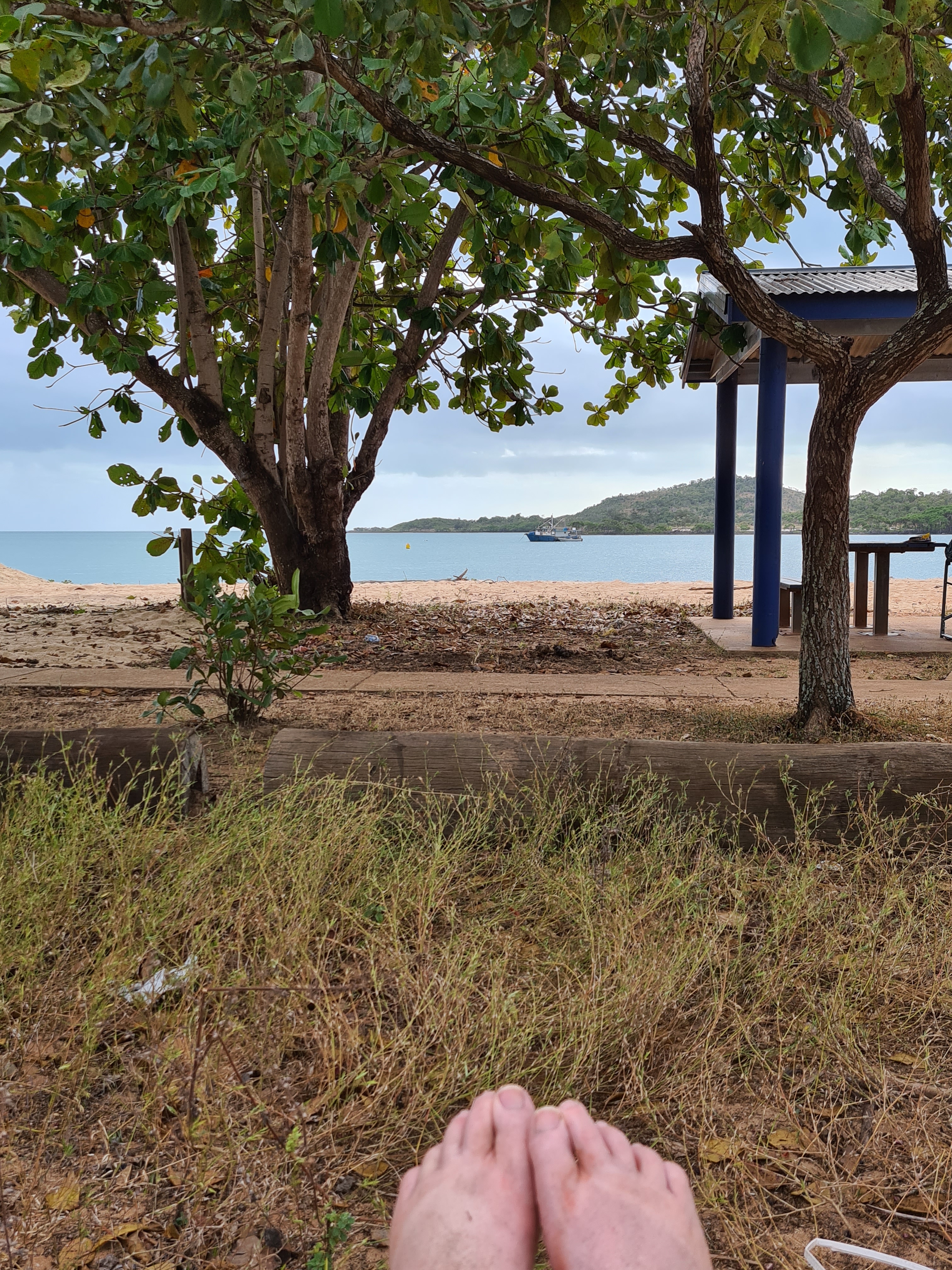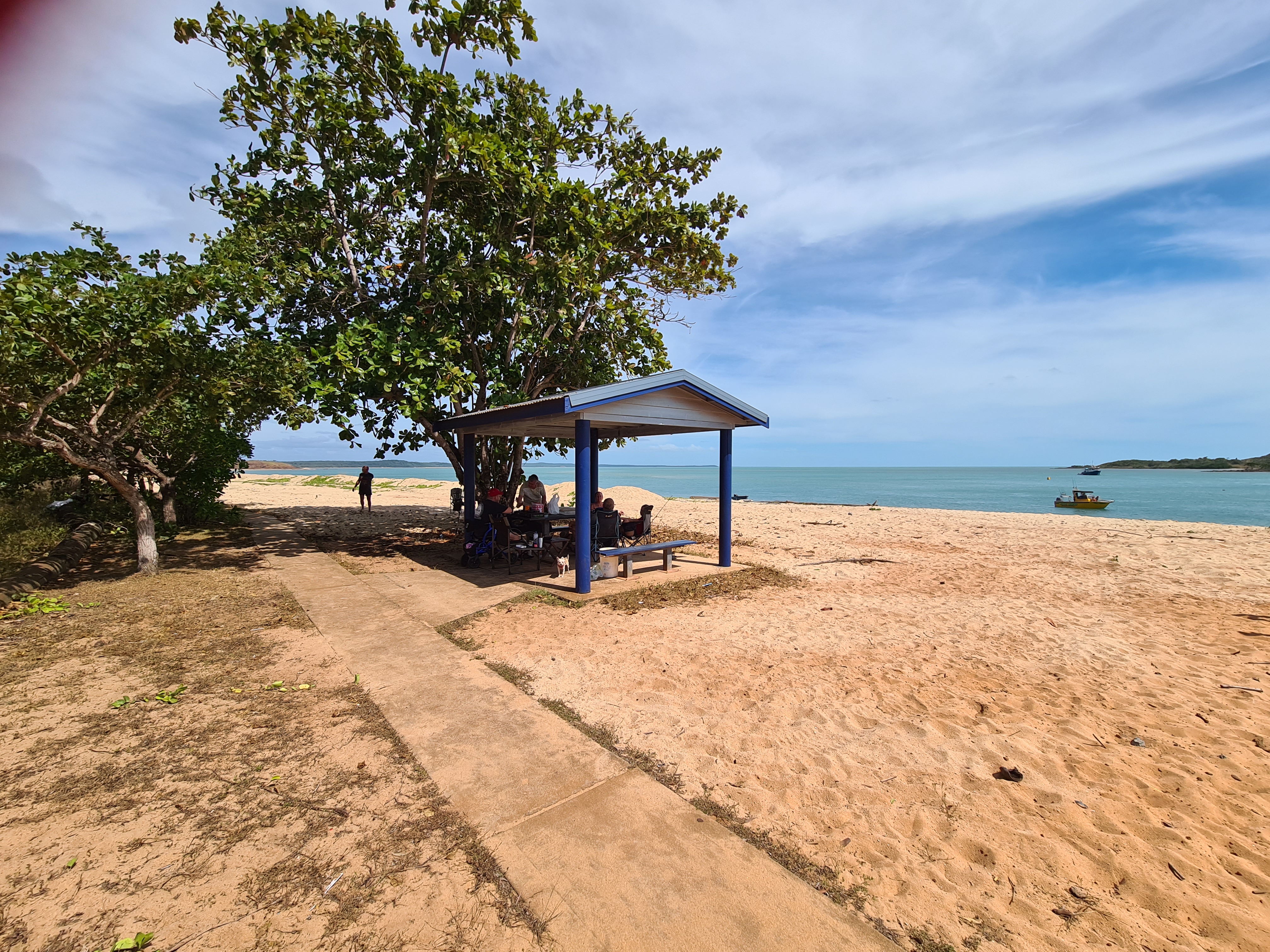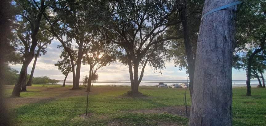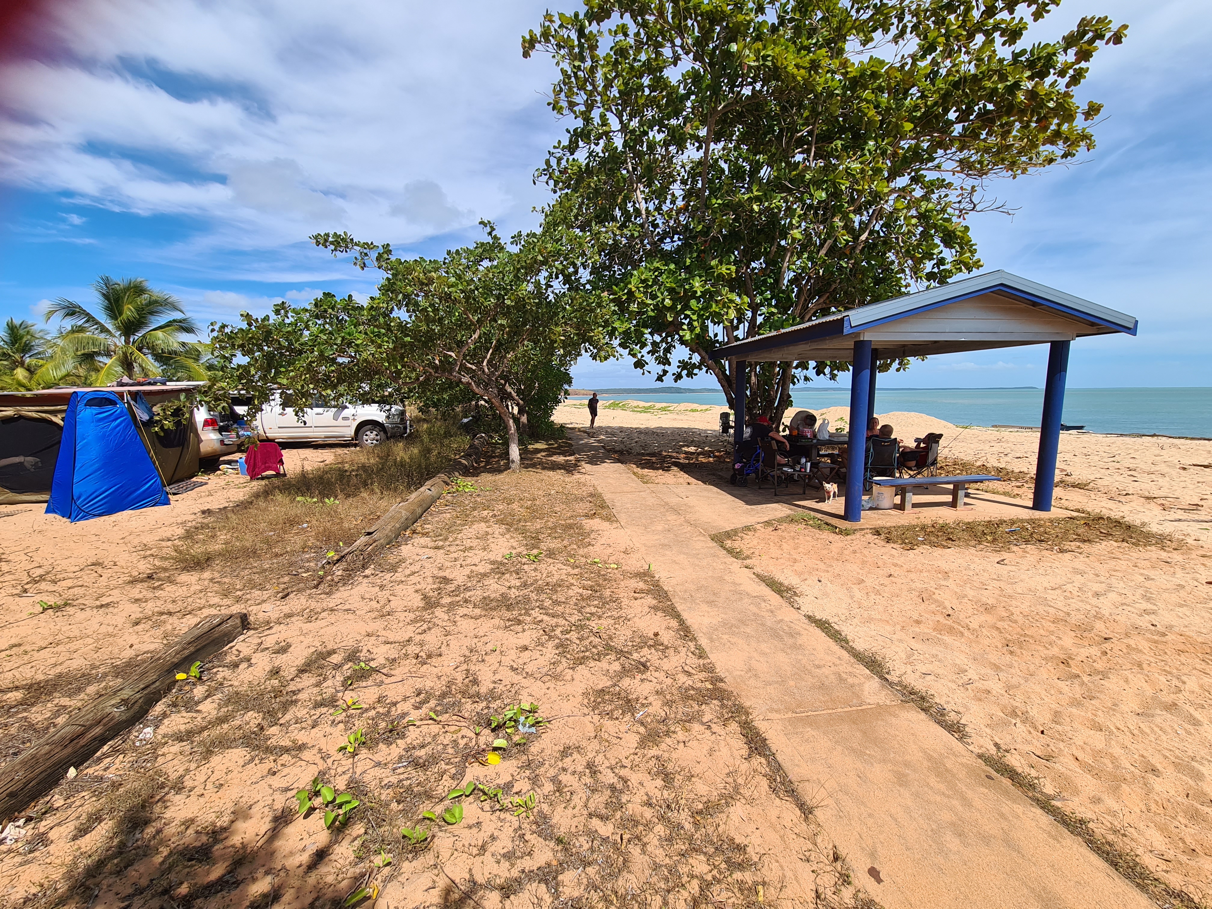 We had planned to stay in Bamaga but when we got there, well, it was not what we were expecting!! Don’t really know what we were expecting really but certainly thought it would be bigger than it was. No sooner we were in Bamaga we had come out the other side. We all decided we would continue on and go see what Seisia was like, we had had lots of people telling us to go and stay there as it was lovely. We drove towards the Jetty and as we pulled in to the car park there we all just said, “Wow”. It was stunning, a lovely wide beach that went for miles and an island in view. We saw some people camping at the back of the beach but could not see how they got there as there were bollards stopping cars from entering. Jock went and asked one of the campers and we went about booking a site. Set up didn’t take long and we got the perfect spot at the beach with a covered table area that we could use, perfect. As we sat there looking out to the sea and all the scenery we could not believe our luck a few days here would be just the ticket.