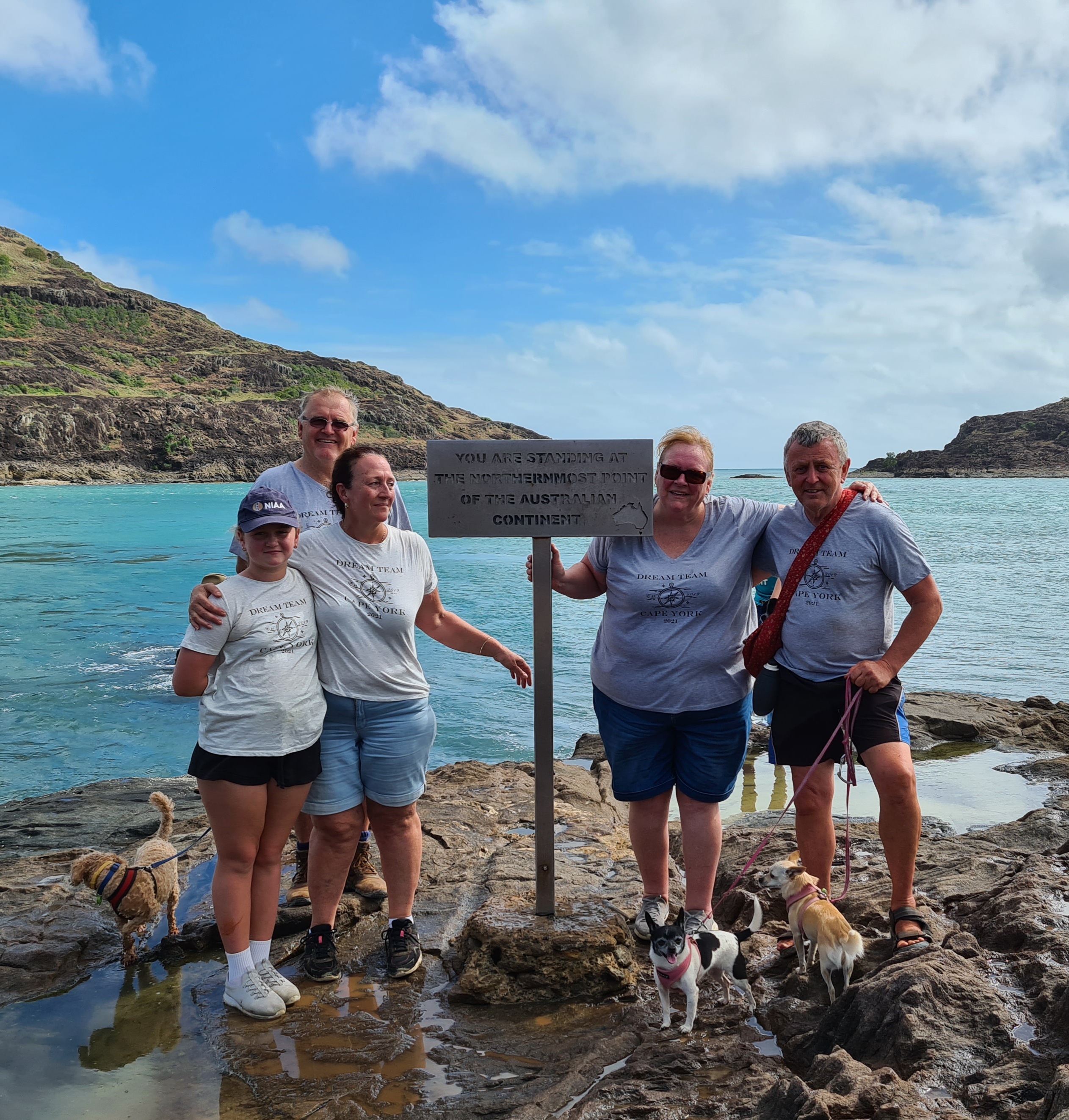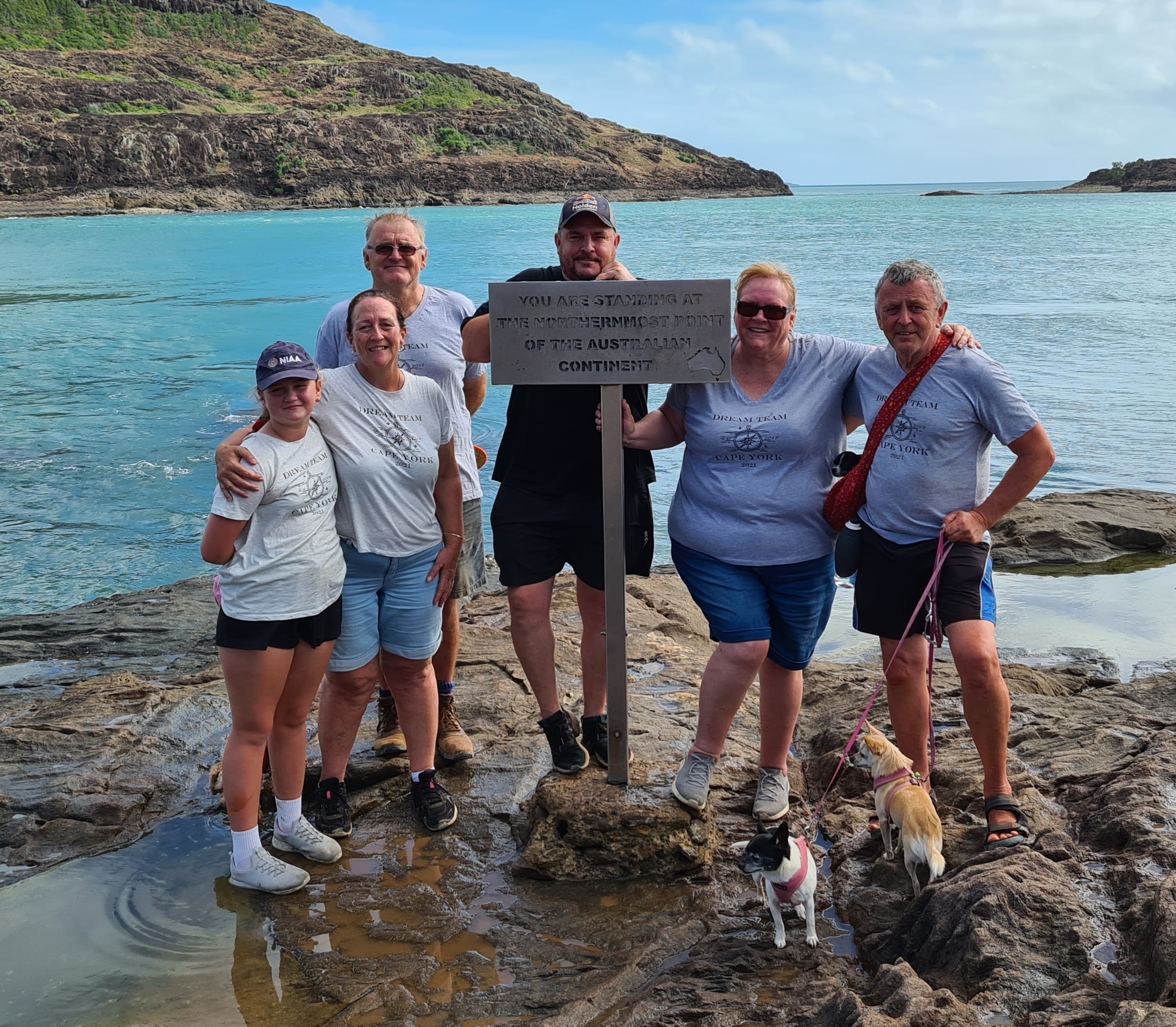 Michelle and Scott walked ahead and came back and told me its not too much further and encouraged me to do it. I am glad they did although not too much further was fine but the rocks between and steep parts were not! Scott let me hold on to his shoulders which helped my back no end as I could lean forward to alleviate the pain. The Dream team got me there, everyone helping and encouraging. We had to wait for photos as we were there with a large group, I didn’t mind as I could get my breath back and sat on a rock for a while. Michelle and I attempted live facebook but I don’t think it worked very well we could not see the screen for the glare. But there we were at the tip, the whole point of our trip and the dream team stood proudly with their t-shirts on and had our photo taken.