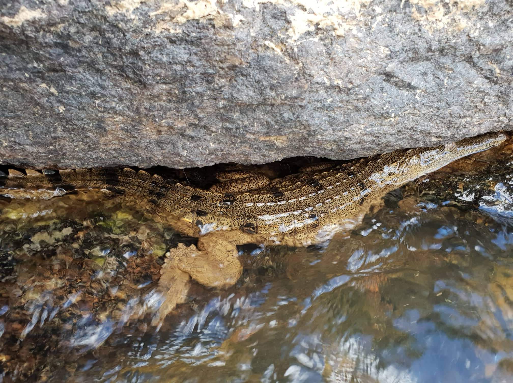 There were two girls playing near to us, they were taking it in turns to ride the “rapids” on a big tube. After about the third round one of the girls came up to us and said there was a croc!!!!! OMG I stood up so fast and was about to get out. Michelle asked, is it a freshie, yes it was a freshie and it was hiding in the side of the river bank. Oh thats ok then!!!!! Really??? Michelle convinced me we were ok, so we headed over to take a look. The girls parents were by now over there taking photos, I climbed back up on the bank and looked over but couldn’t quite see it. It’s better viewed from the water the father exclaimed………..yeh right!!! I stayed put, Michelle and Jock got in for a look and to get photos. Fresh water crocodiles are somewhat smaller than salt water crocs and they do not attack unless you corner them or aggrivate them. So leave them alone and they will leave you alone. We took our photos and then went back to enjoying the water but to honest I could not fully relax knowing he was so close by.
