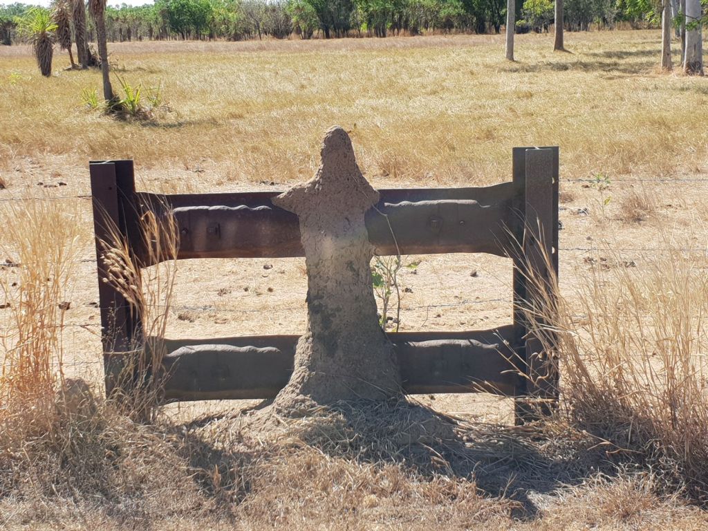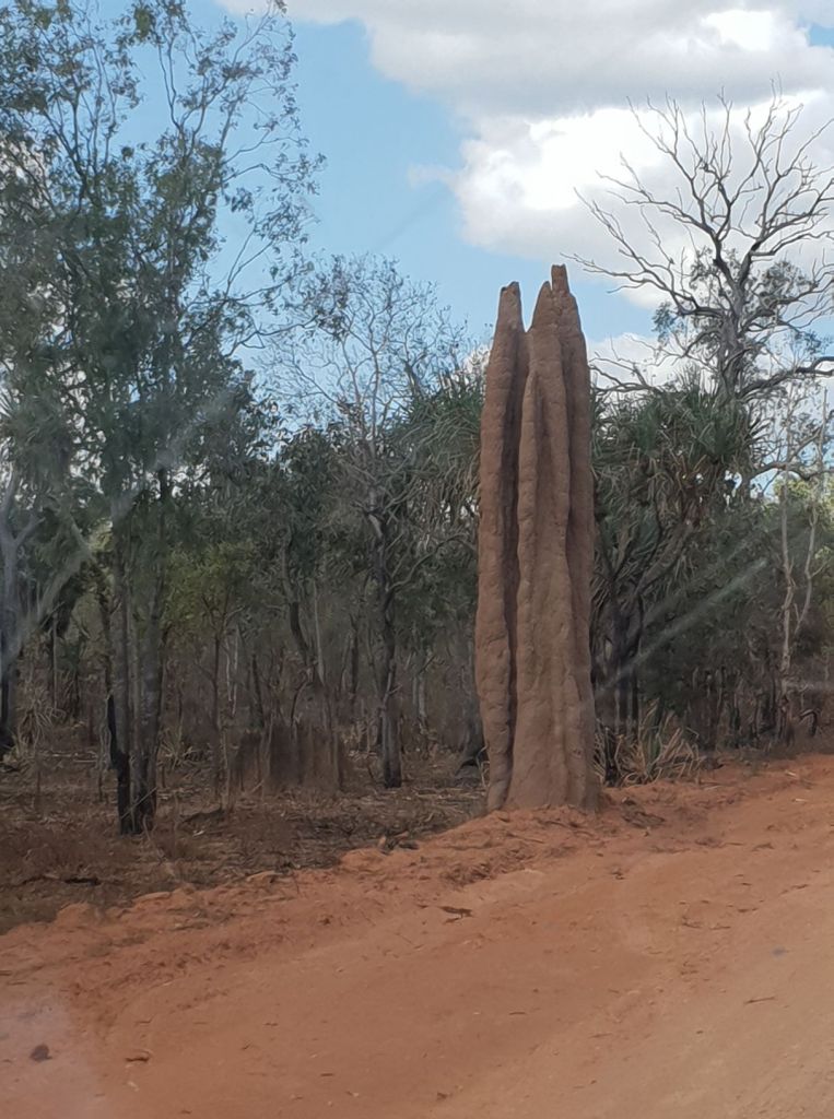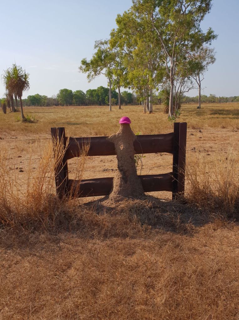 Michelle spent all of the next day packing for their trip and making sure everything set for leaving the van for a few days. Their flight was early hours so Jock got them to Darwin airport for 12.00 midnight. They would arrive very early Friday morning, go to the wedding Saturday then fly back up to Darwin Sunday arriving late evening, it was such a rush for them and they were completely knackered. Jock and I on the other hand were nice and relaxed having had all that time to do nothing although we readied ourselves for breaking camp, our drive to Nhulunbuy was fast approaching. Whilst Emma was away with mum and dad I had gone out for a drive and added a hat to an ant hill we had spotted, Emma would laugh every time we passed it as it was being built next to an old farm gate and it looked like it was leaning up against the gate with its elbows resting on top. We called it Harriet but she ended up being called Henry Snell as it really did look like Henry’s pose(look back to Fitzroy Crossing and you will see what I mean). Anyway the hat was added for Emma so on our last drive past she would be surprised by it.